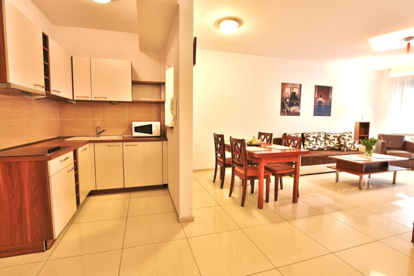 Apartament z 1 sypialnią. Jest to apartament z aneksem kuchennym z przyborami kuchennymi i czajnikiem elektrycznym. Apartament - 5 osobowy. Powierzchnia pokoju ok.: 48 mkw. ;